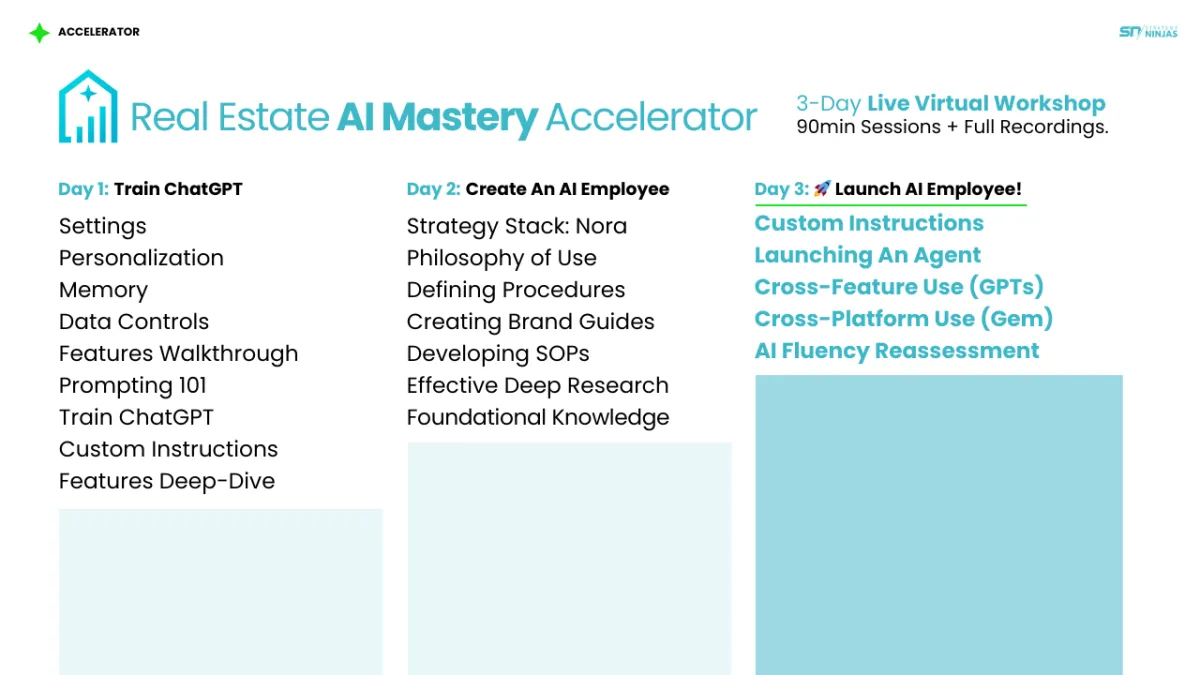 Participants leave with a clear blueprint for building and scaling their own "Level 1" AI team, digital twins, client assistants, and marketing strategists that work 24/7. They gain the skills to future-proof their business by automating high-value tasks, improving responsiveness, and continuously evolving AI tools to stay ahead of the market.